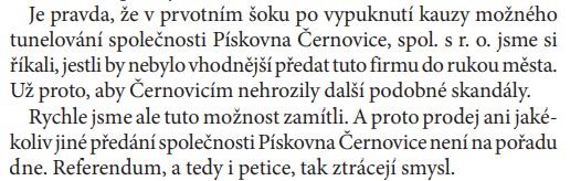 V posledním čísle Černovin v roce 2022 věnuje paní starostka celou stránku reakci na námi vyvolané referendum. Pominu-li to, že to naprosto odporuje často deklarovaným výrokům paní starostky, že nerada diskutuje přes noviny, tak je to jasné zneužití prostoru v novinách, které mají sloužit jako informační servis občanům.
