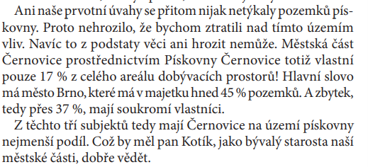 Pokud by městská část převedla na město společnost Pískovna, tak současně s tím převede i pozemky, které má Pískovna ve vlastnictví. To, že jsme o část vlivu už přišli, je práce paní Quittové a pana Hasoně. V září 2021 se totiž městská část dobrovolně vzdala velké části pozemků (to je velká část z oněch 45 %, o kterých paní starostka píše). Tehdy to bylo obhajována tím, že je potřeba tento krok udělat, aby město mohlo vyřešit problémy v dané lokalitě (viz například Viz například: https://youtu.be/NgXNTwne_5k?t=5968). Nic se od té doby ale nevyřešilo.